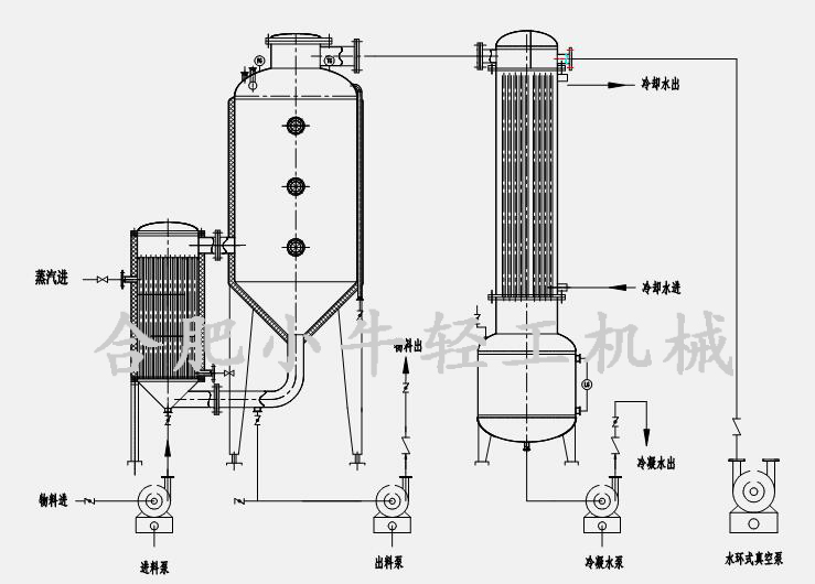 單效外循環(huán)蒸發(fā)器(單效濃縮器)主要由加熱器、分離器、冷凝器、冷凝水罐、冷凝水泵、真空泵、物料泵、電控系統(tǒng)、管路系統(tǒng)幾部分組成。主要部件均采用304、316L2205等優(yōu)質(zhì)不銹鋼材料制成。