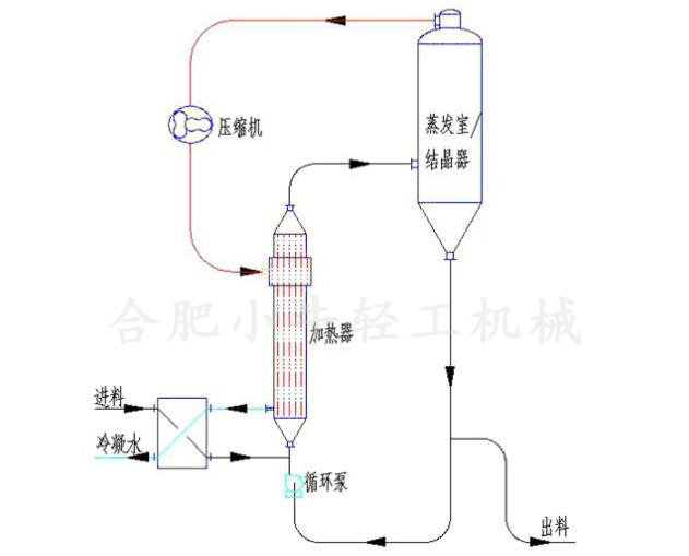 物料在加熱器的管程內被殼程的蒸汽加熱溫度升高,在循環(huán)泵作用下物料上升到分離器中,在分離器內由于物料靜壓下降使物料發(fā)生蒸發(fā)。蒸發(fā)產生二次蒸汽從物料中溢出,物料被濃縮產生過飽和而使結晶生長,解除過飽和的物料進入強制循環(huán)泵,在循環(huán)泵作用下進入加熱器,物料如此循環(huán)不斷蒸發(fā)濃縮或濃縮結晶。晶漿從循環(huán)管路中用出料泵輸出。蒸發(fā)分離器內的二次蒸汽經(jīng)過蒸發(fā)分離器上部的分離和除沫裝置凈化后輸送到壓縮機,壓縮機把二次蒸汽壓縮后輸送到加熱器殼程用作蒸發(fā)器加熱蒸汽,實現(xiàn)熱能循環(huán)連續(xù)蒸發(fā)。
